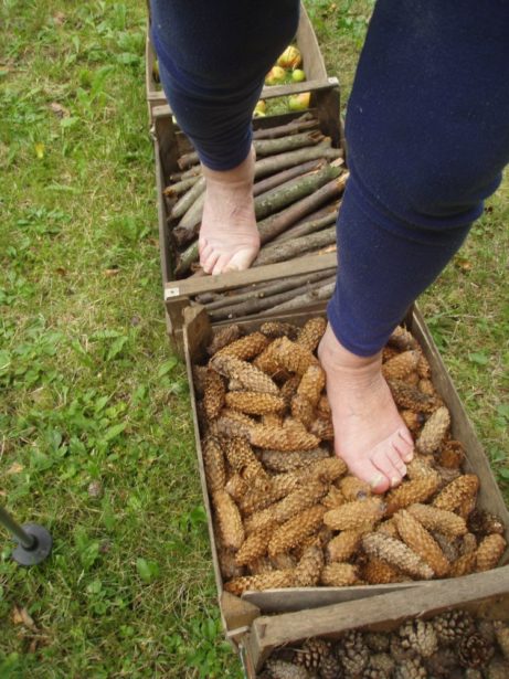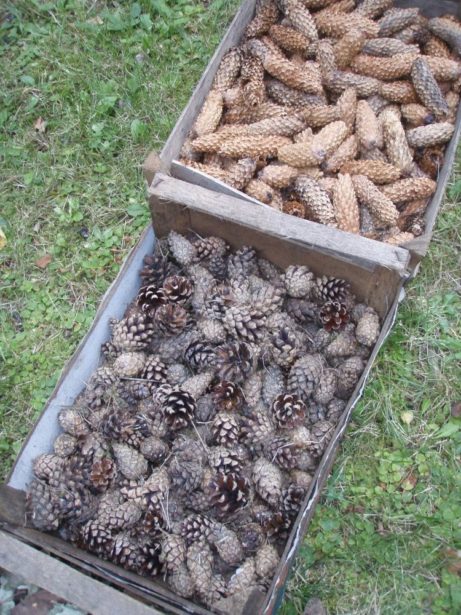 Šišky z modřínu, ze smrku, z borovice a nebo ty jedlové… ? Některé jsou už pěkně otevřené, jak se asi po nich půjde?