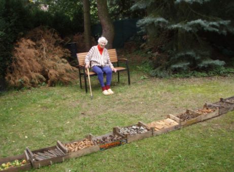 Na zahradě přidáme ještě popadaná nezralá jablíčka, poskládáme naštípaná polínka. … a pestrý povrch našeho chodníčku je skoro hotov.