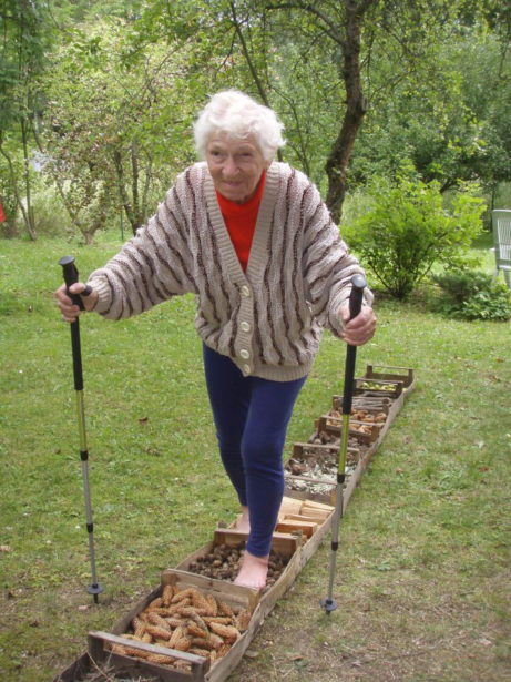 I naše babička byla dost zvědavá. Pozorovala, jak stezka vzniká, až neodolala. Boty a ponožky šly dolů, ještě hůlky – přece jen nedávno oslavila už jedna-devadesátiny – a hurá na trať! Jedno kolo jí nestačilo, tak ještě podruhé…